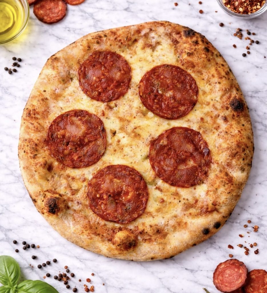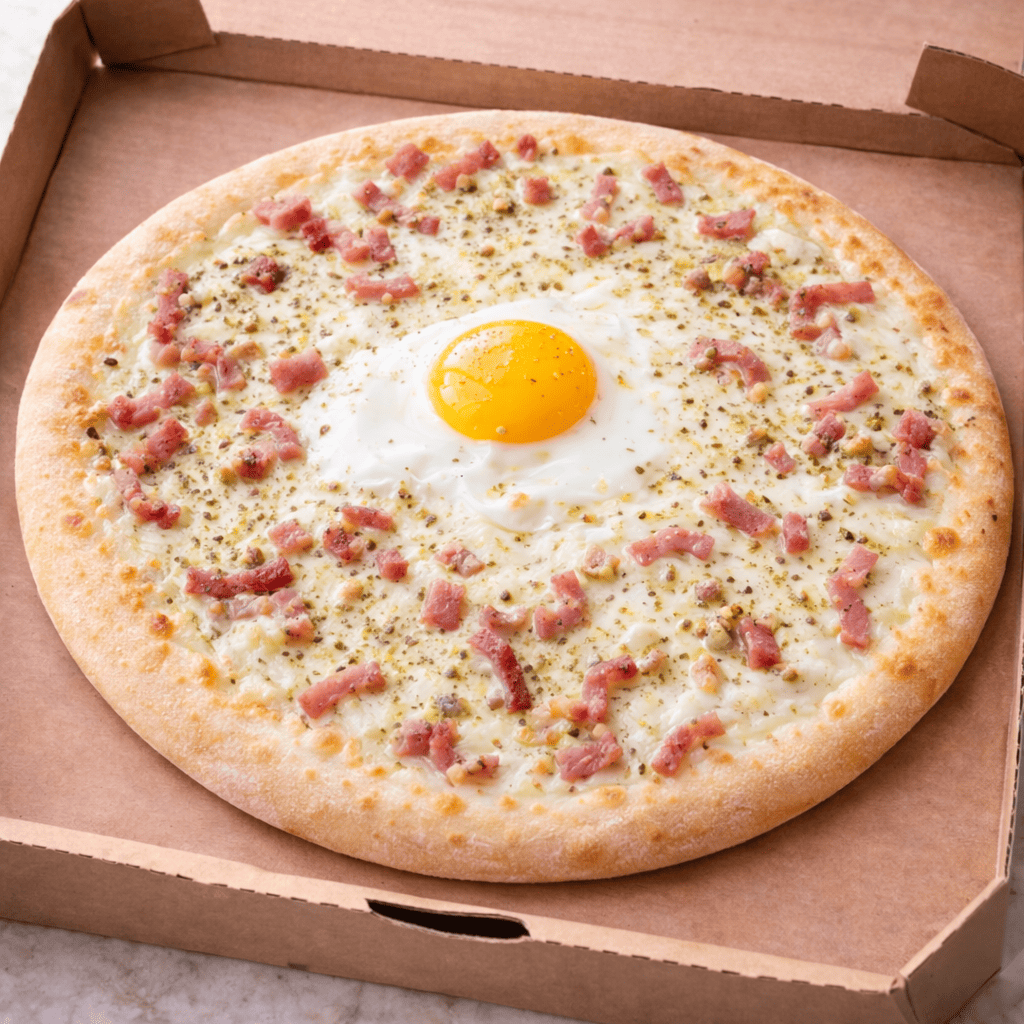 Une pizza généreuse avec mozzarella, lardons, œuf et origan.