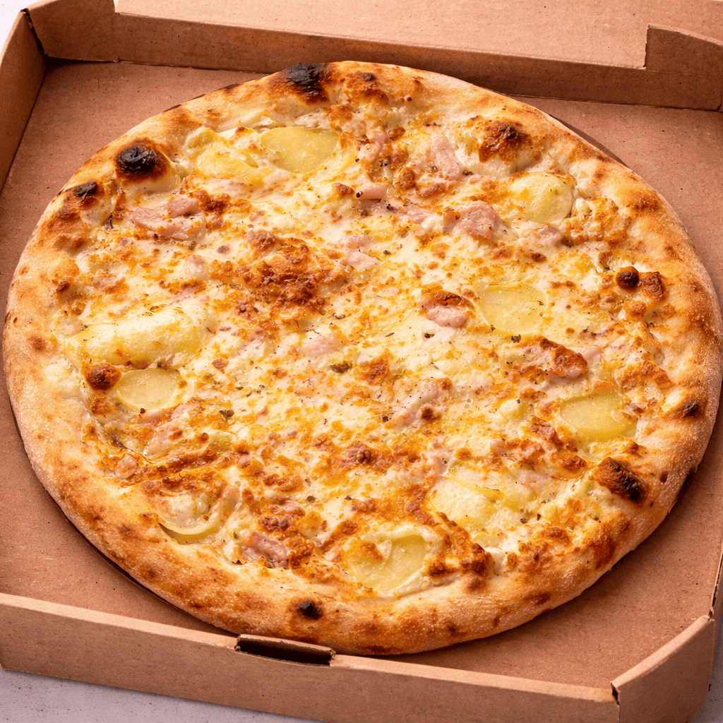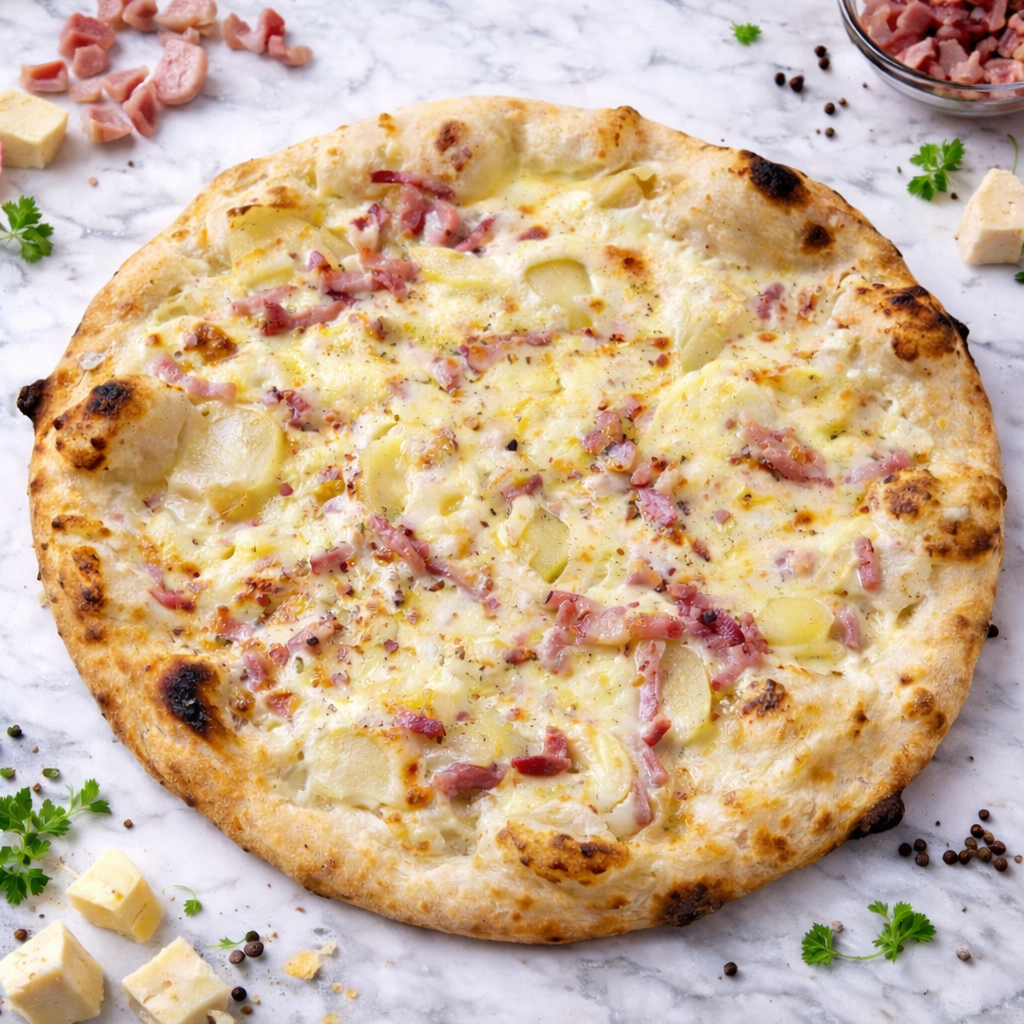 Une pizza gourmande avec mozzarella, reblochon, lardons, pommes de terre, origan et oignons.
