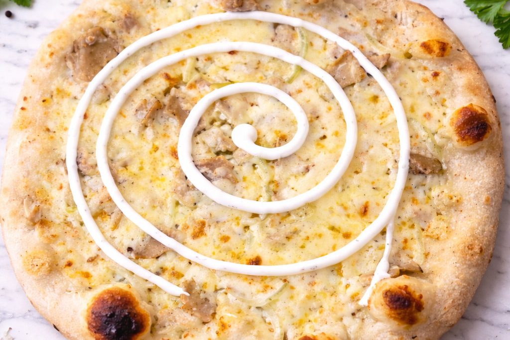 Une pizza généreuse avec mozzarella, kebab, oignons et sauce blanche.