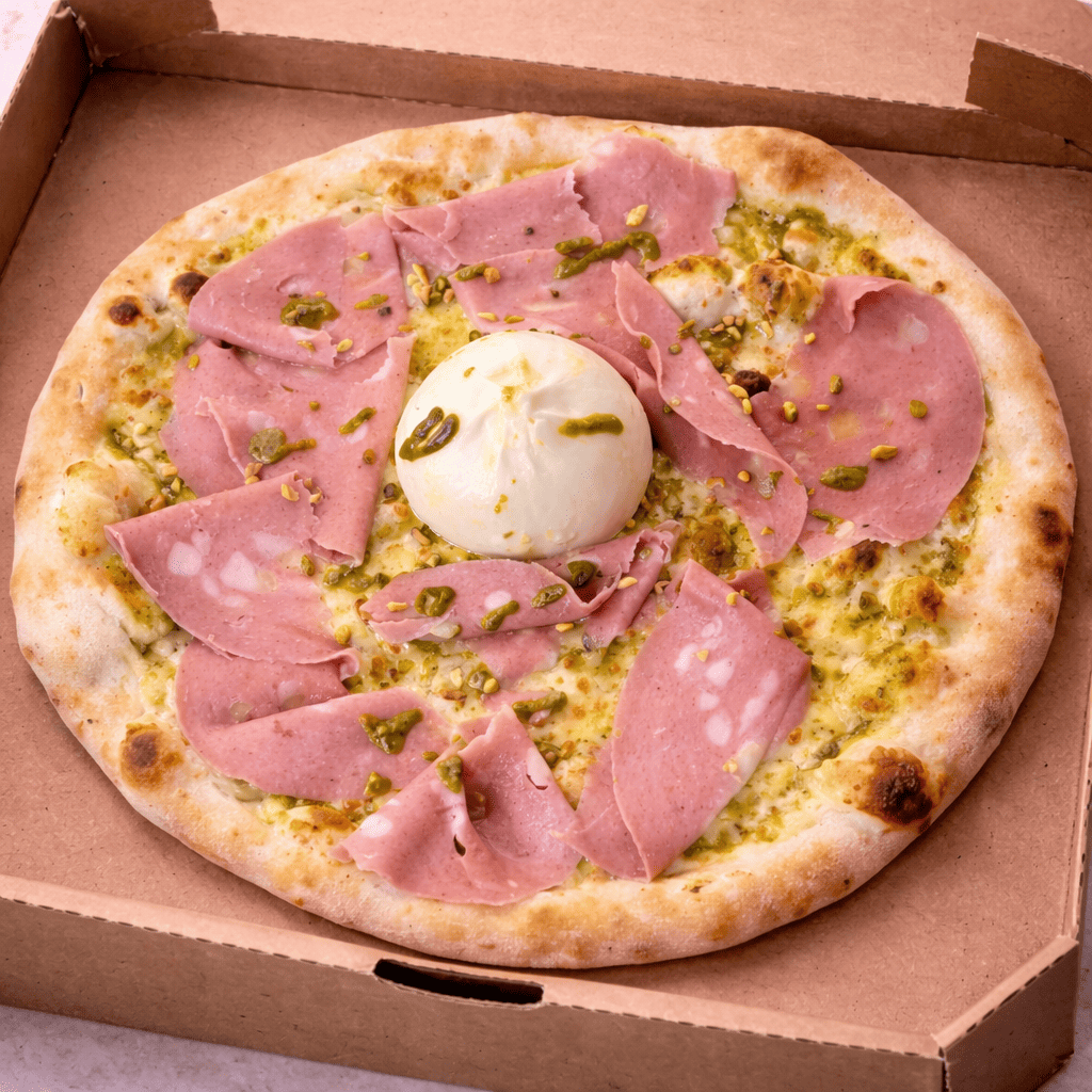 Une recette gourmande avec base crème de pistache, burrata, mortadelle et éclats de pistache.