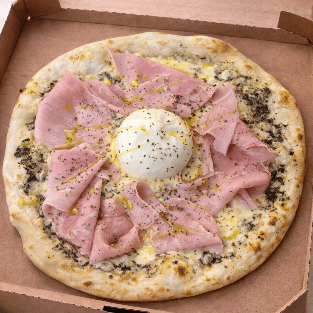 Une pizza raffinée avec base crème de truffe, mozzarella, burrata et basilic.